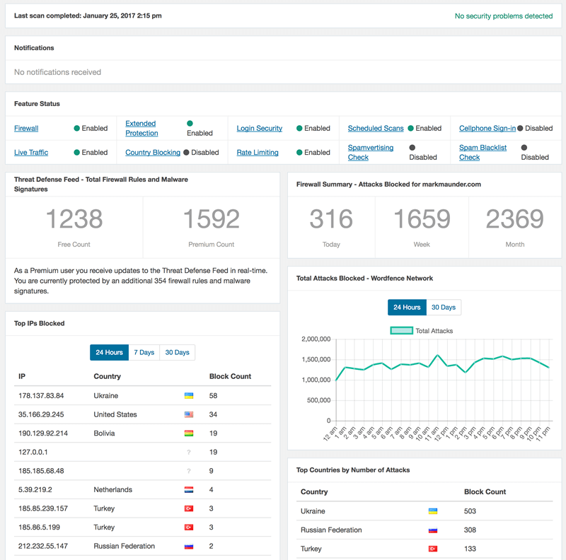 Wordfence also has a high-level overview of your site’s activities in its dashboard:
