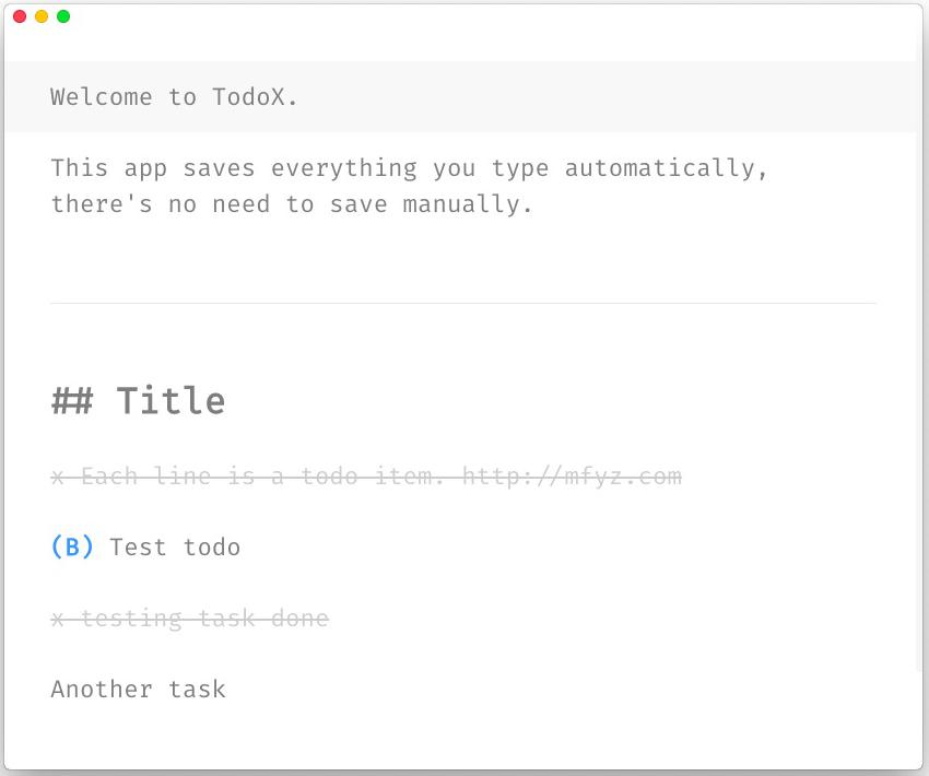 I love this format is because I use it in a few different tools on my platforms. Wasn’t super happy with the desktop solutions, so I forked and enhanced a simple code editor written on electron/nodejs. Added a few capabilities and adjusted the color schema to my liking and open sourced published it (You can find, download and contribute to it here: https://github.com/mfyz/todox).