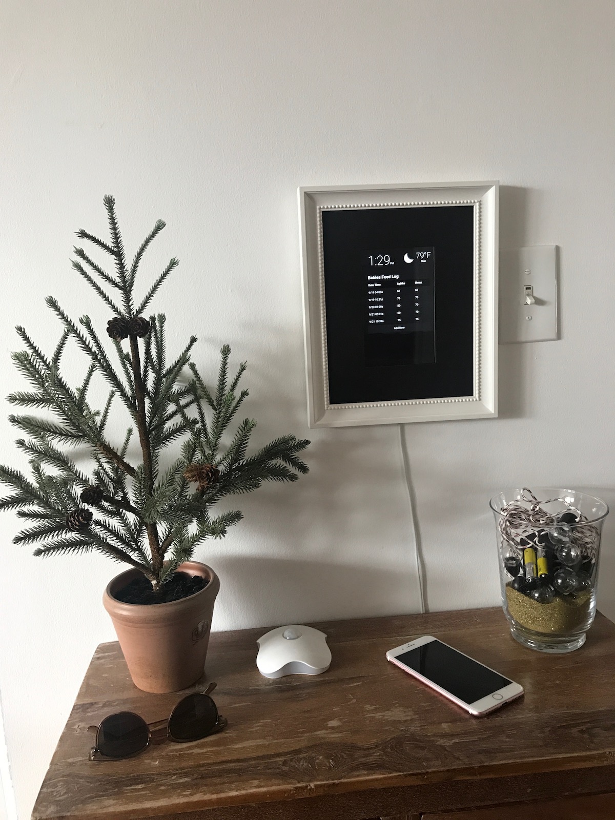 Sticking a tablet on the wall is not my way of doing this. So I hacked an IKEA frame to embed tablet screen with a black canvas cardboard and hide the tablet.