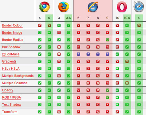 Yeşil kolonlar her tarayıcının son sürümündeki css3 property desteği, kırmızı bölge değişmemekte ısrar eden ie’nin css3 property destek tablosu.