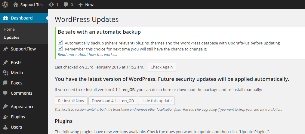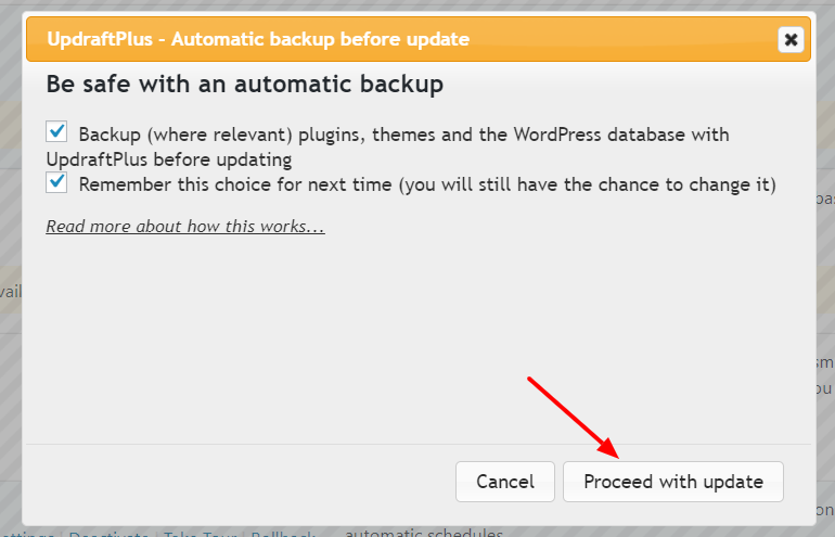 The pop-up basically reminds us that if the user wants to take a backup before proceeding with updates. One of the most common reasons your WordPress site will break is when you update your plugins. Your plugins may not be careful with backward support and/or they may miss a buggy use case that you are using their plugin with. When the update happens, your site reading behavior may be impacted, or even page rendering that will basically break your pages which is more serious. When this happens, Updraft’s notice that takes a backup before performing updates which will be a reference point for you to restore in case needed.