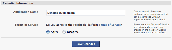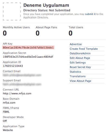 Connect ile ilgili bilgilerden Connect URL’i belirtmek zorundasınız. Bu url, facebook connect’i kullanacağınız sayfanın adresi olmak zorunda. Mesela siz http://www.deneme.com/giris/ sayfasında facebook connect kullanacaksanız buraya bu adresi girmek zorundasınız. Facebook connect’i zaten sadece giriş sayfanızda kullanacaksınız. URL’leri ayarladıktan sonra değişiklikleri kaydetmeyi unutmayın. Son durum olarak uygulama özet ekranınız aşağıdaki gibi olacaktır: