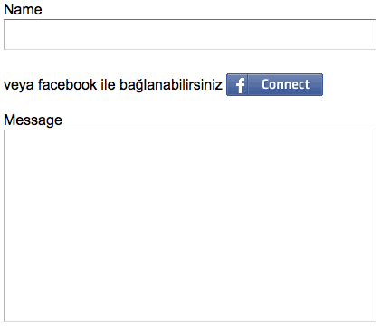Son olarak formumuza facebook connect butonu ekleyelim. Bunun için formda ilk div içinde yer alan input’un altına