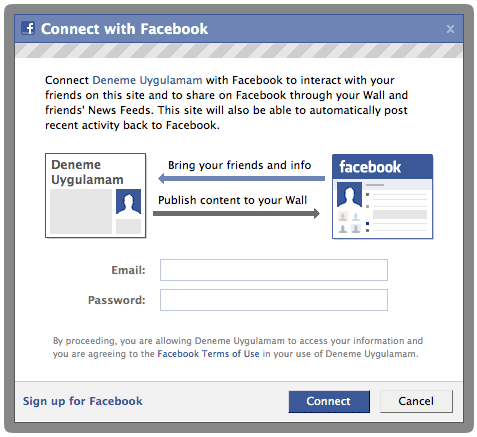 Bu koddan sonra facebook connect butonuna basıp giriş yaptığınızda sayfa aşağıdaki gibi şekilleniyor: