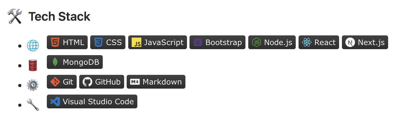 You should be pinning some of the projects that you think it reflects your best professional work. Aside of pinning these example projects, let’s talk about pimping up your profile view. This does not mean throwing every github markdown feature you find online in your profile view. You need to be really mindful of what you are showing on your profile. It has to be meaningful. Don’t put HTML/CSS or Word/Excel badges. Your goal is to get a recruiter interested in reading more of your profile and projects. So the purpose of this practice is to make your profile more skimmable.