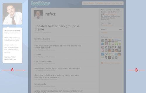 Aslında 770px olması bu dökümanda bahsettiğim konunun ortaya çıkmasını sağlamıştır. Profil ayarlarınıza girecek olursanız orada “Design” sekmesinde artalan imajını, link, artalan renkleri gibi bazı basit stillerle oynayabilmenizi sağlamaktadır. Bu esneklik ve genişliğin az olmasından kaynaklanan safe zone içinde kalan boş alanları değerlendirerek reklamvari artalanlar hazırlanması son dönemde popüler bir konu olmuştur. Hatta ABD’de bu konuda hizmet veren servisler bile ortaya çıkmıştır.