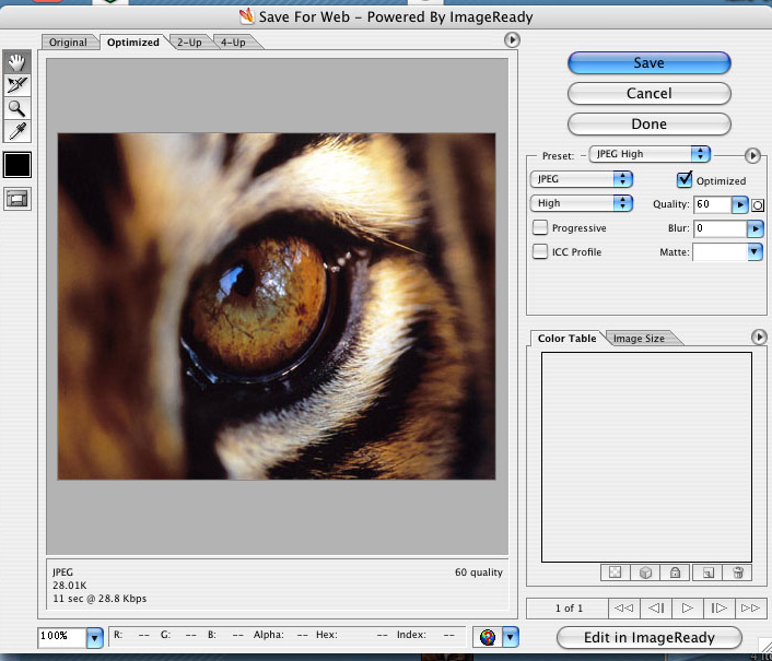 Gimp kullanırken bile webde kullanacağım grafikleri photoshop ile optimize ediyordum. Photoshop’un save as web seçeneği ile çıkan pencere ile olacak bütün işimiz, Aynı zamanda bu mekanizmayı Adobe ImageReady programı ile de yapabilirsiniz. Şimdi gelelim nasıl olacağına ve detaylara.