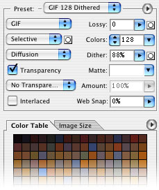2. nokta ise gif optimizasyonunu yaptığımız kısım, yani renk sayısı. Colors’daki değer yani.. Bu değeri elle de girebilirsiniz fakat o kadar ince bir optimizasyon yapmıyorsanız esgeçip menüsündeki değerleri deneyebilirsiniz. Dither olayının ne olduğunu bilmiyorum, 1-2 kb değiştirebiliyor bazen.. Oynayıp görmek gerek.. Seçtiğiniz renk sayısına ait renk skalası hemen bu panelin alt kısmında oluşacaktır. Renk sayısını ne kadar azaltırsanız resminizdeki renkler ton olarak kayıp vermeye başlayacktır. Eğer siyah-beyaz resimler export ediyorsanız Gif gerçekten mantıklı seçim olacakıtr. Fakat renk sayınız çok ise ve dökümanınız büyük boyutlarda ise mesela 300 piksel ve üzeri, o zaman jpeg ve png seöçeneklerini denemenizi tavsiye ederim.