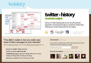 Twitter geçmişinizi yedeklemeyi belki hiç düşünmediniz ama bu araç twitter geçmişinizi post tarihlerine göre ical takvim dosyası şeklinde almanızı sağlıyor. Basit bir şekilde twitter kullanıcı adınıza göre ical dosyası şeklinde export alıyor ve icalendar, google takvim veya outlook’unuza import edebiliyorsunuz.